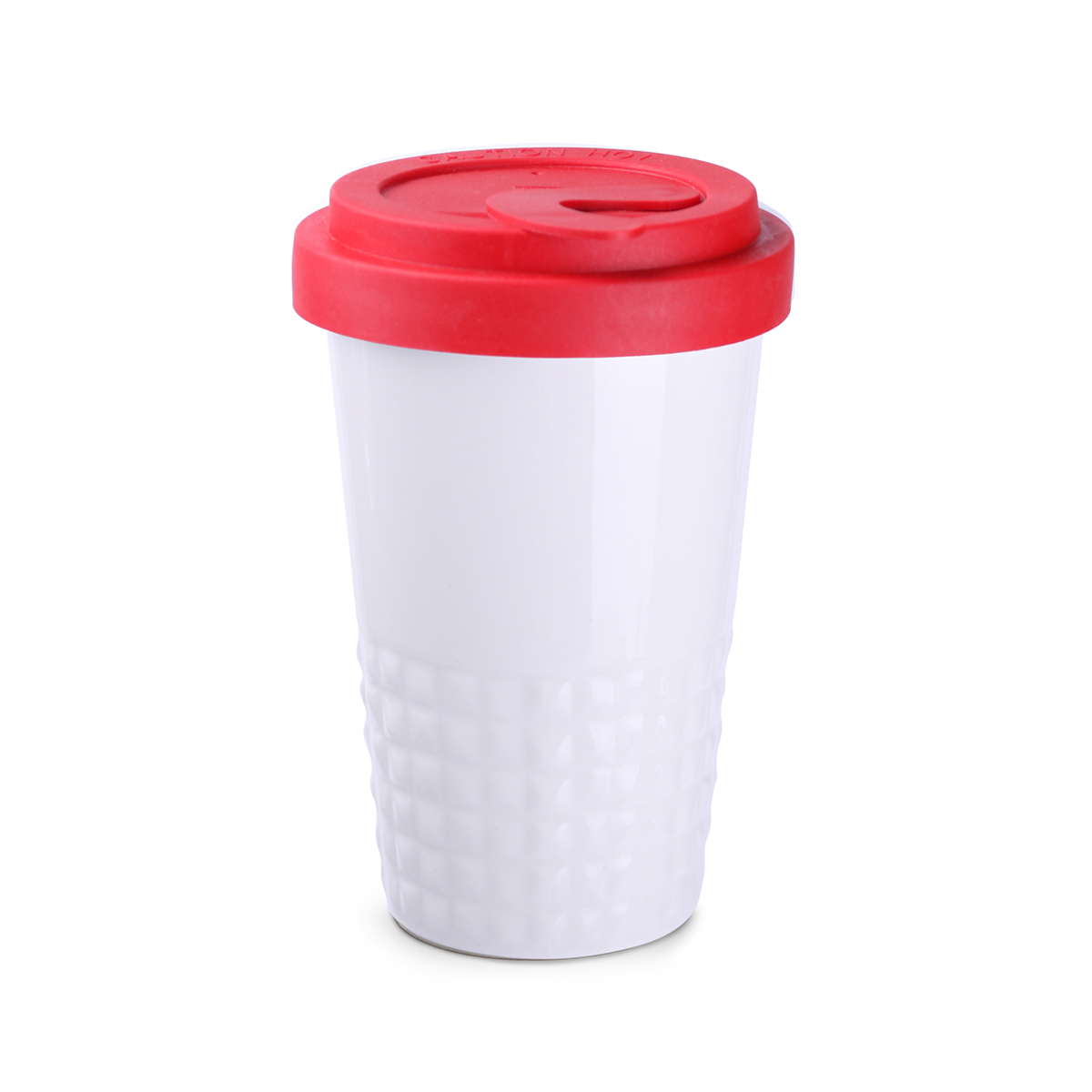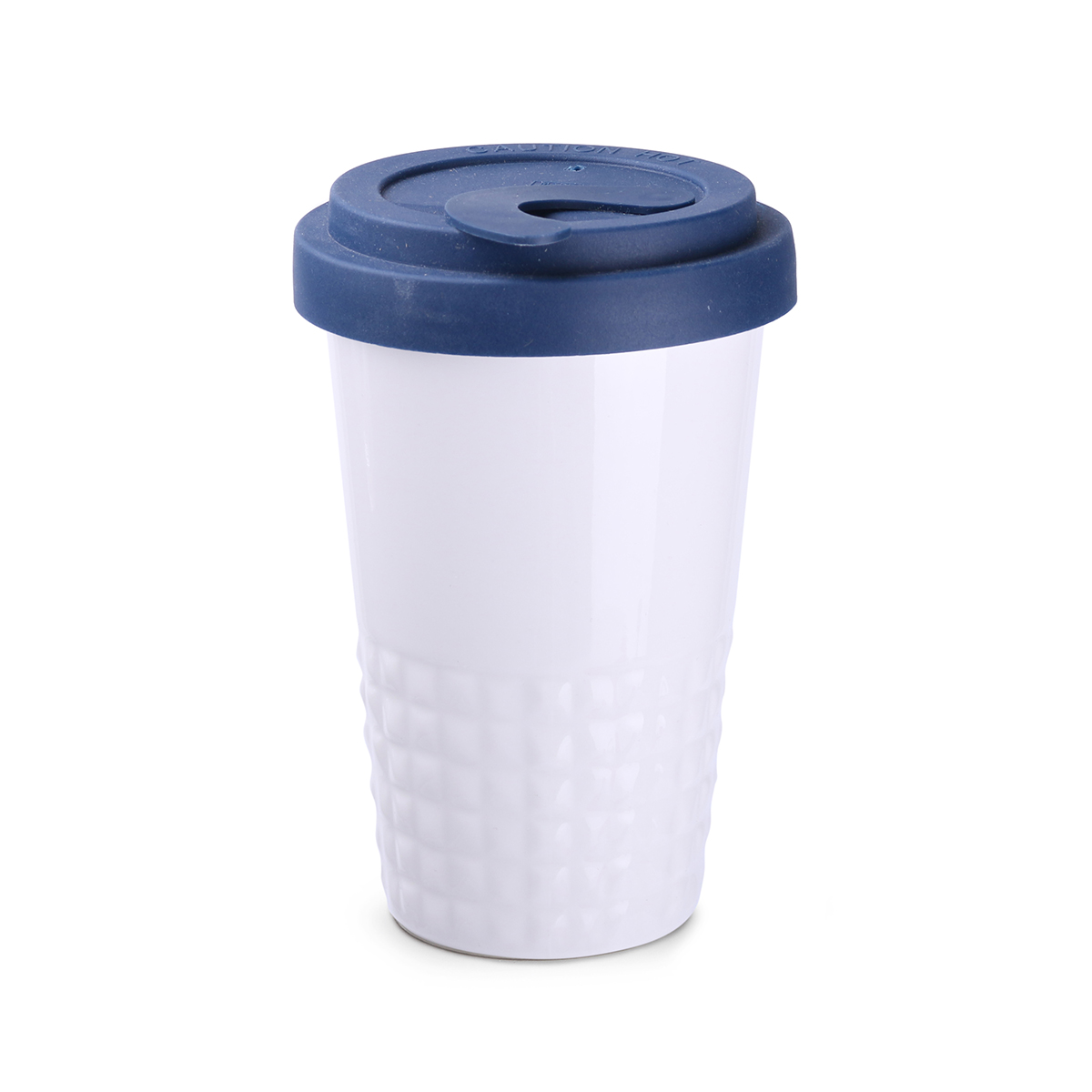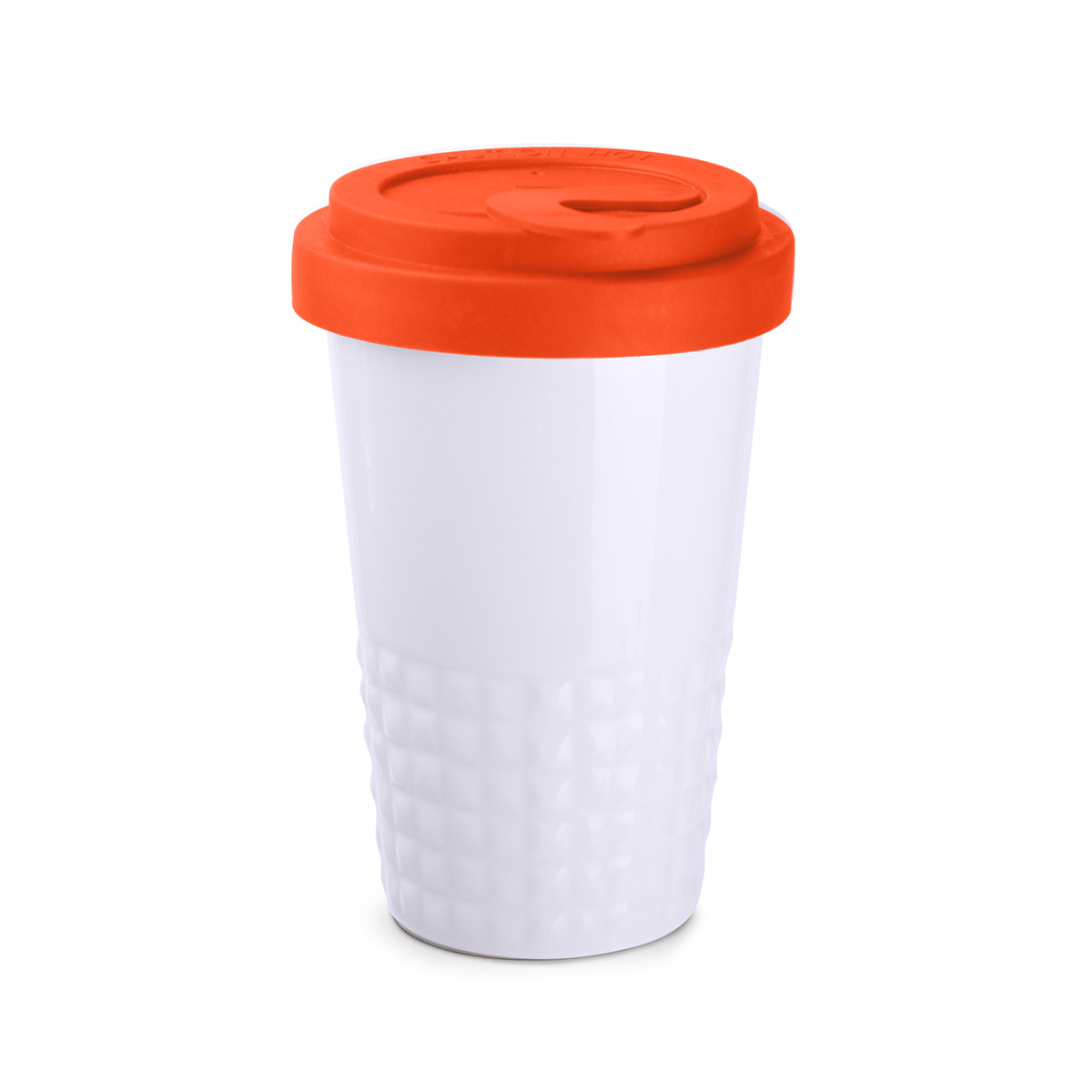 Raffiniertes Design durch symmetrisch-erhabene Form im unteren Bereich des Bechers. Doppelwandiges Porzellan mit perfekter Isolationsfunktion und dicht abschließendem Deckel.
