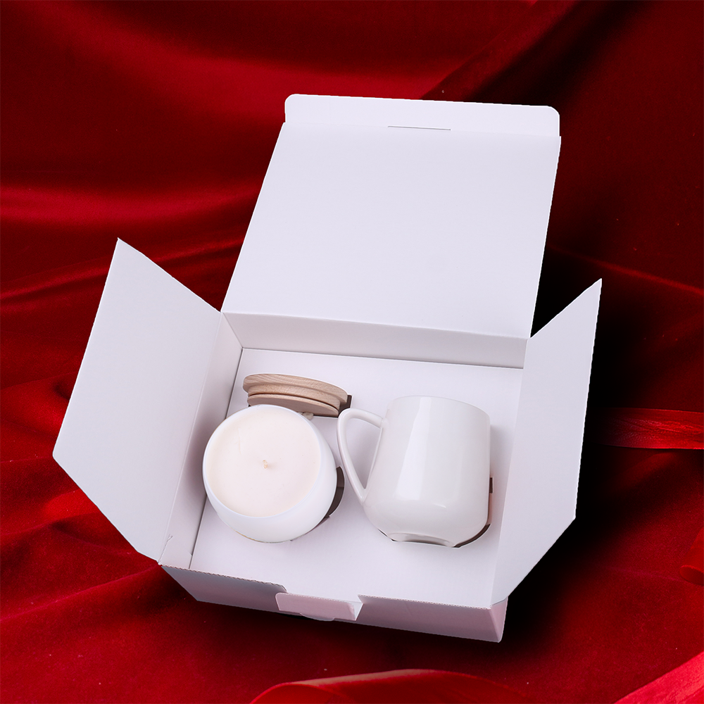 Der zarte Porzellanbecher Eris zusammen mit der individualisierbaren, umweltfreundlichen Glamour-Kerze mit Sojawachsfüllung. Die Kerze verfügt über einen Holzdeckel, der den Duft länger bewahrt und ebenfalls mit Branding versehen werden kann. Das Set ist in einer speziellen umweltfreundlichen Snowy-Verpackung verpackt und mit einer eleganten personalisierten Banderole versehen. DIE DARGESTELLTE VERZIERUNG DIENT NUR ZUR VERANSCHAULICHUNG UND IST NICHT IM PRODUKTPREIS ENTHALTEN. DAS SET IST IN EINER SPEZIELLEN SNOWY-VERPACKUNG MIT EINER AUSGEWÄHLTEN VERZIERUNGSOPTION ERHÄLTLICH.